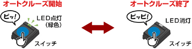 作動開始時スイッチを押すと「ピッ!」と音が鳴りスイッチ上部のLEDが点灯、解除時には「ピッピ!」と鳴りLEDが消灯し解除をお知らせします。
