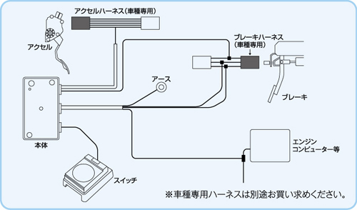 車種別のオートクルーズコントローラー、アクセルハーネス、ブレーキハーネスを使用しますので、全メーカーの車両へ取り付けが可能となっております。