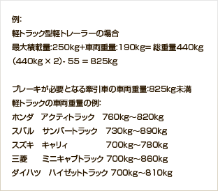 道路交通法によりますと、総重量が750kgを越えるトレーラーでは例外なくブレーキ装置が必要となりますが、トレーラー総重量750kg以下でも、牽引車の車両重量 + 55kgがトレーラーの総重量の2倍に満たない場合、ブレーキが必要になります。
